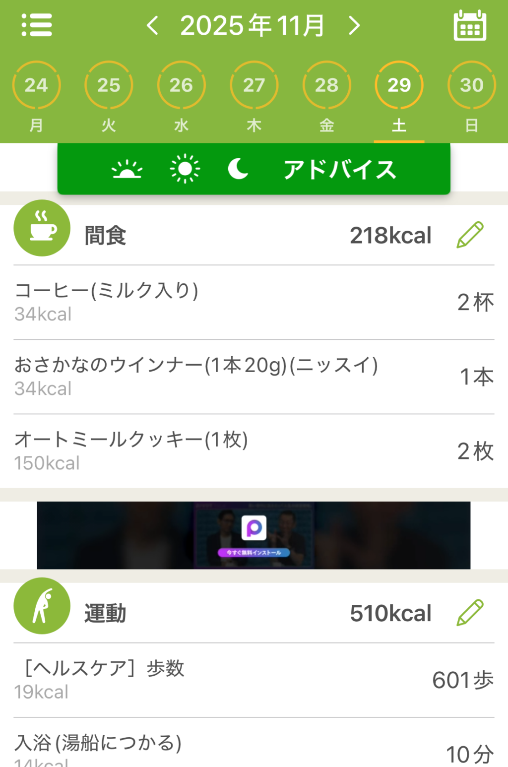 今までカロリーについて、ざっくりとしか気にしていなかったのですが、実際に自分の食べているお菓子の内容を入力すると、すぐに過剰になってしまい、厳しいな…と感じました。