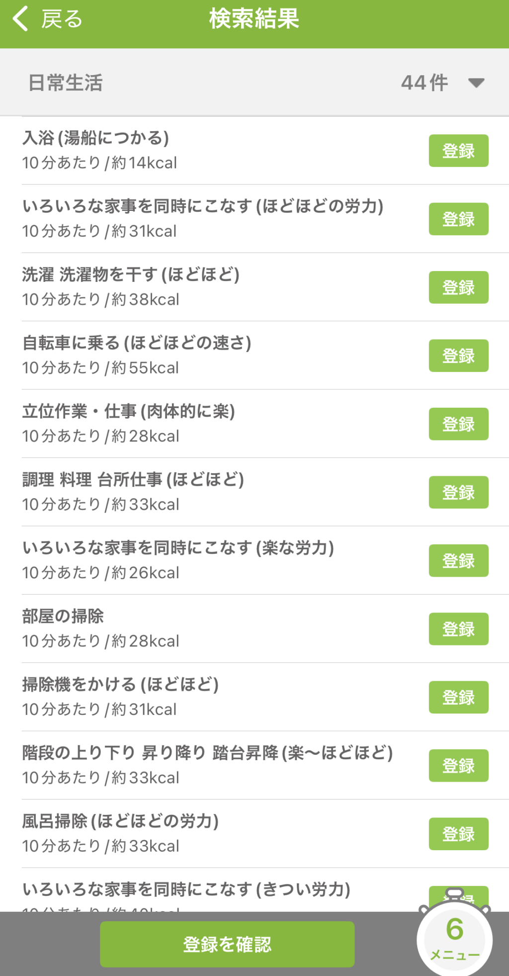 あすけんの運動には日常生活という項目があり、家事や作業の項目が一覧となっています。