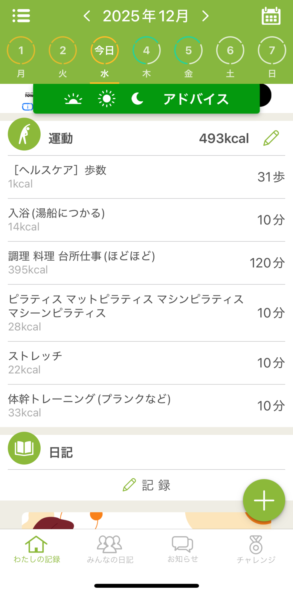しかし、あまり消費カロリーを稼げず、また、せいぜいそれぞれの項目を10分ずつやるので精一杯だったため、休日は点数が低いことが多かったです。